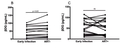 The cross-sectional assessment involved the chronic HIV with and without ART and the early onset HIV without ART. Those patients with newly diagnosed (within 6mo) were followed longitudinally to assess how ART affected BD glucan levels. In general, BD glucan levels were higher in early onset infection (67.9 +/- 40.7 pg/mL) and chronic infection (88.5 +/- 30.9 pg/mL) compared to uninfected controls (20.4 +/- 13.3 pg/mL, p-value <0.001). The values were independent of age, sex, CD4 and CD8 T cell counts. This was also independent of any STI. Notably, those with chronic HIV had higher levels than early HIV regardless of ART use: