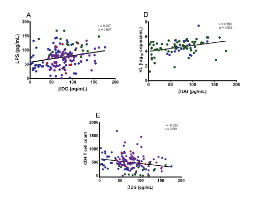 Further, they also show weak correlation between beta-D glucan levels and gut mucosal damange, bacterial translocation, systemic immune translocation and other things you can take a look at. The interesting thing is the correlation between BD glucan and HIV progression: