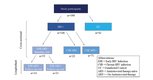 This is a cross-sectional and longitudinal assessment of BD glucan levels in 146 patients living with HIV. Within this cohort, 53 had been diagnosed within 6 months, 22 had chronic HIV but no ART, and 71 had chronic HIV and were on ART. These were then compared to 42 uninfected controls. The study design is as follows: