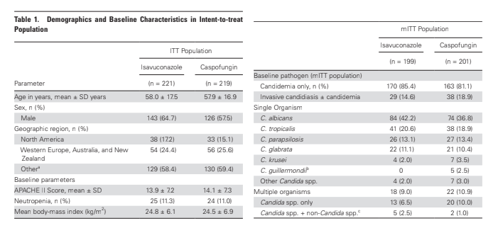 They ended up recruiting 221 patients in the isavuconazole arm and 219 in the caspofungin arm. Both groups were fairly well balanced. As were the types of Candida: