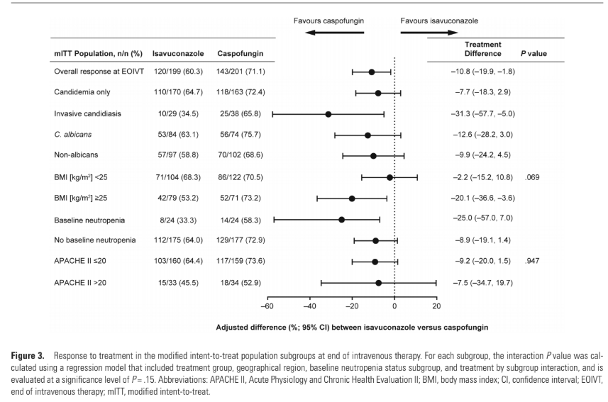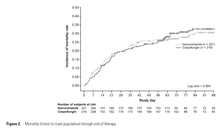 The ACTIVE trial! This is a phase III, RCT, double blind, multicenter, non-inferiority trial comparing isavuconazole vs caspofungin in invasive candidiasis. Folks, in ID, it doesn’t get any better than this (look at all these studies!) Exclusion criteria were Candida in any body part (i.e. osteomyelitis, IE, meningitis), severe immunodeficiency, >48hrs of other antifungal therapy. The intervention was between IV isavuconazole 200mg q8h for 2 days followed by 200mg daily for at least 10 days or caspofungin 75mg once followed by 50mg daily for at least 10 days. After this, it was up to the physican to step down to either PO isavuconazole or PO voriconazole. Patients were randomized in a 1:1 ratio. Primary endpoint was overall response to therapy in the modified ITT population (defined as mycological eradication, clinical cure or improvement at the end of IV therapy within 48hrs…hmm…ok..makes sense I guess since the comparison is between Isavuconazole and caspofungin). Secondary end point was overall response at 2 weeks after end of therapy. Patients were treated for a minimum of 14 days.