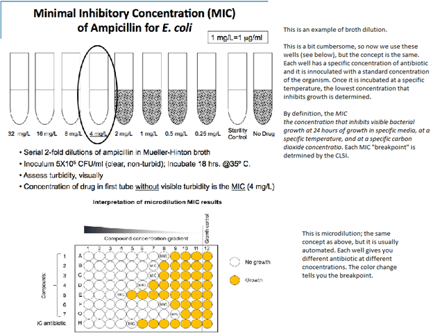 TL;DR – the above methods measure the minimum inhibitory concentration. In other words, MIC = concentration of antibiotic that inhibits bacterial growth at 24 hours in a specific media, at a specific temperature. So this is the number that we clinically use. So how do we calculate MBC?