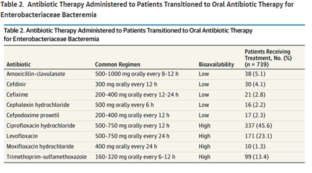 They also note 6 episodes of recurrent bacteremia within 30d in the PO therapy group vs 4 in the IV therapy (HR 0.82; 95% CI 0.33-2.01) Notably, the IV therapy group had a longer hospitalization, median of 5 days in the PO group vs 7d in the IV group (HR 0.98; 95% CI 0.97-1, p-value <0.001). Most of the patients who received PO therapy had either a FQ or TMP-SMX, which were considered to be the “highly bioavailable” antibiotics:
