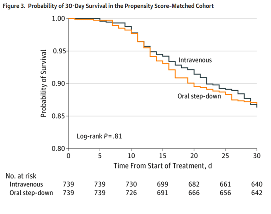 Of course, this makes sense. Sicker or higher risk = IV. They used one to one propensity matched cohort in their analysis. There was no difference in the number of deaths between either group (97 deaths, 13.1% in the PO step down vs 99 deaths, 13.4% in the IV group, HR 1.03; 95% CI 0.82-1.30. Kaplan-Meier curve: