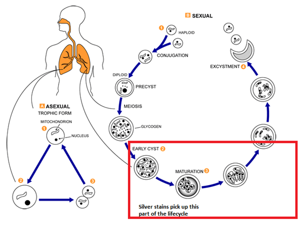 - Wright-Giemsa stain – straight forward, no fixation required, but you can confused clumped Neutrophils for PJP. Can detect any stage of the Pneumocystis