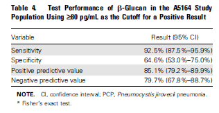In a study of hematological malignancy patients (19), 53 patients were retrospecrtively evaluated for PJP pneumonia with both PJP PCR and BD glucan. The sensitivity and specificity are highlighted below: