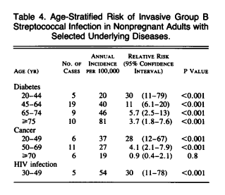 And, I guess I should say, not surprisingly, African Americans were twice as likely to have invasive GBS infection (6.5 per 100,000 in AA, 3.2 per 100,000 in White). Further, those people residing in Fulton Count (which includes the urban center of Atlanta) had a RR of invasive GBS infection of 2.9 when compared to the 7 other counties.