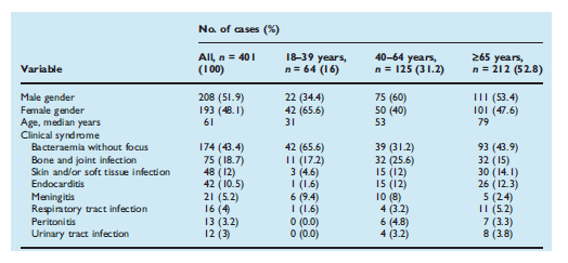 The more common co-morbidities found were diabetes, heart disease, renal disease, and pulmonary disease. Overall, mortality range from 1.4% in osteomyelitis to up to 27.5% in peritonitis, 17.5% in pneumonia/empyema, and 12.9% in bacteremia: