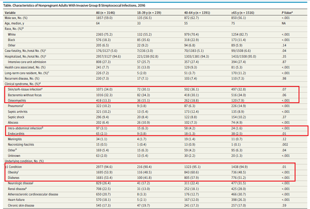 A more recent cohort study (8) from the VA evaluated GBS in 5497 (mostly white male) patients. In this cohort, most of the invasive GBS was in the form of osteomyelitis (21.3%), followed by bacteremia without a focus (18.4%), and SSTI 16.7%):