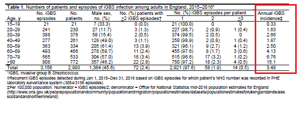 A retrospective study from England (7) evaluated 3156 episodes of invasive GBS. The incidence, once removing 479 episodes of pregnancy related GBS, was 2.9 cases per 100,000. As noted before, the incidence tended to go up with age, although there was a prevalence of cases in those aged 30-39, mostly due to female and pregnancy cases.