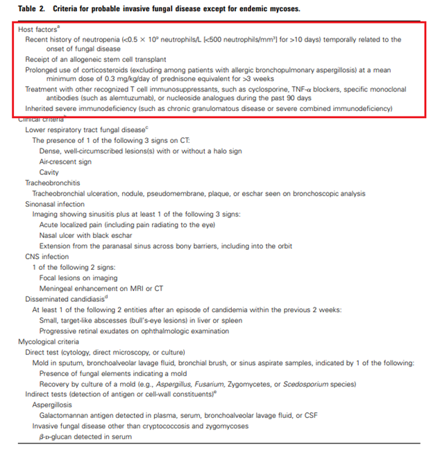 This is where we find ourselves most of the time, in the probable diagnosis. This means we will not get a biopsy but rather other methods to diagnose IFI, such as BD glucan, galactomannan, bronch, etc. Keep in mind that in order to apply this criteria, you need to have some sort of host factors: