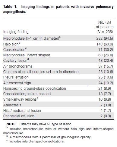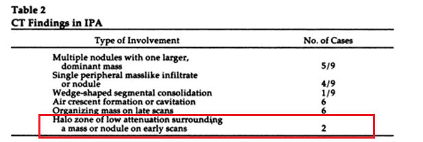 They note the halo sign preceded the development of typical cavitation or air crescent by at least 2-3 weeks and typically the progression went from “halo” to cavitation. A small number of patients, but the takeaway was that invasive pulmonary aspergillosis could look like anything.