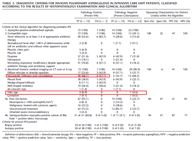 In those that are not immunosuppressed, the halo sign tends to fare worse in terms of sensitivity. In a multicenter observational study evaluating a clinical algorithm in the ICU setting for invasive pulmonary aspergillosis (4) patients with proven invasive pulmonary aspergillosis by biopsy were more likely to have non-specific infiltrates or consolidation than halo sign. Indeed, in this study, one patient with colonization actually had a halo sign on their CT: