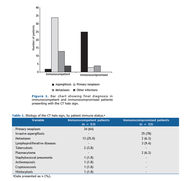 The most comprehensive study on the topic comes from Brazil (6). This was a multicenter retrospective study of CT chest images of 85 patients presenting to 7 tertiary centers with the goal of determining the diagnostic value of the CT halo sign in immunocompetent and immunocompromised patients (AIDS, congenital immunodeficiency, recent chemotherapy, radiation, neutropenia). In the immunocompetent group with the halo sign, the most common diagnosis was primary neoplasm, this contrasts with the immunocompromised, where aspergillosis was more common: