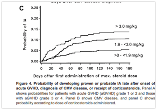 This is a difficult question. Some immunosuppressed states, such as liquid malignancies and post-HSCT are easy enough. One of the key questions is regarding steroids. Most of the data re: steroids comes from the stem cell transplant and leukemia population (7). For instance, one study (8) in those patients with recent allogeneic HSCT patients found that higher doses of steroids was associated with higher incidence of invasive mold infections (with doses of 0.1-1.9mg/kg/d having a HR 2.2 (95% CI 1.3-3.8) and doses >3mg/kg/d having a HR 4.9 (95% CI 2.3-10.6). Another study found that use of steroid for GVHD prophylaxis had an OR 2.1 (95% CI 1.1-4.1) for invasive IFI (9). Further studies (10) have found a similar trend: