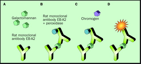 The test of choice is a sandwich ELISA. The double-sandwich ELISA incorporate a rat monoclonal antibody called EBA2, which is specific for the B 1-5 galactofuranose. For all I know, that is part of galactomannan polysaccharide. Here is the schematic of how this works.