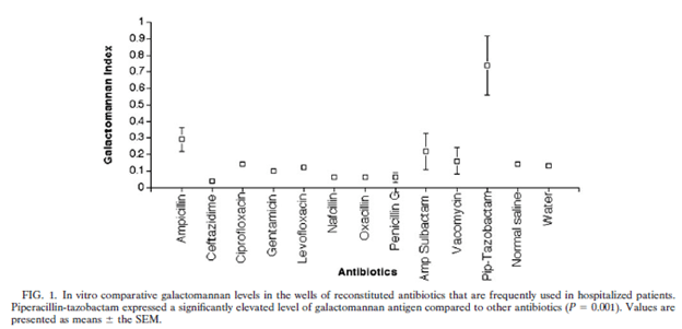 The biggest culprit here is the ubiquitous piperacillin-tazobactam aka Zosyn aka half of the brain dead combination known as Parkla-myacin (the name of which can be modified depending on where you work, it may be referred to as Guerilla-cillin). Remember that Piperacillin is made from fermentation products of Penicillium, which also makes a galactomannan. This may be why cefepime tends to be used in neutropenic fevers, but I digress. One of the earliest studies came in 2004 (9). This prospective study evaluated 26 patients receiving a variety of antibiotics, including 13 getting pip-tazo and the other 13 getting a variety of antibiotics, including imipenem, ampicillin, nafcillin, ciprofloxacin and ceftriaxone. These patients were not high risk for invasive molds. They also evaluated the galactomannan level in vitro in several antibiotics. The overall in-vitro GM level was significantly higher in pip-tazo (at least this formulation) when compared to all others: