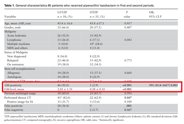 The type of pip-tazo formulation seems to correlate with galactomannan positivity. For instance, another study evaluated the “original” pip-tazo with the generic formulation (12). In 85 patients getting pip-tazo for febrile neutropenia, 35 received the brand name while 50 received the generic formulation. The degree of positivity in the generic pip-tazo was an impressive 92% when compared to the 2.9% of the brand name one: