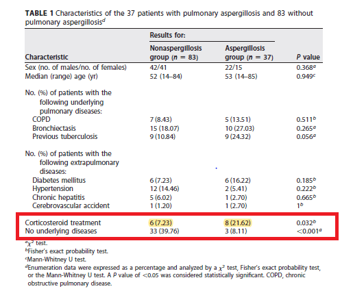 In a 2017 study (15), 37 invasive pulmonary aspergillosis patients and 83 controls (all of which were not neutropenic) were evaluated in terms of risk factors and galactomannan measurements in both serum and BAL samples. In generally, those with aspergillosis were more likely to have received steroids: