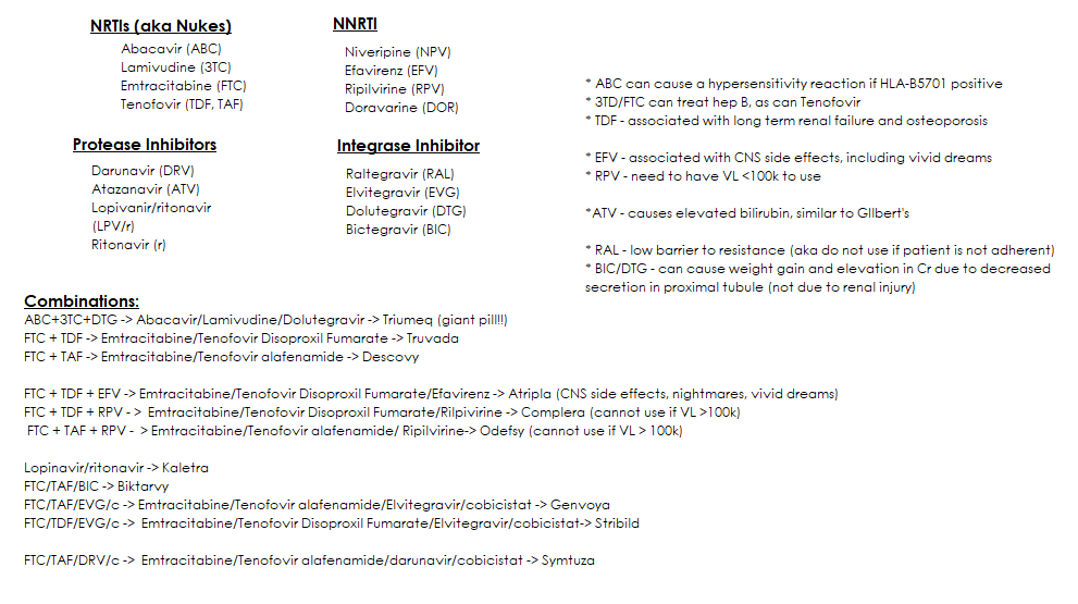 There are newer combinations, which I will not go over (for instance, Dovato aka 3TC/DTG, Juluca aka DTG/RPV, Delstrigo aka TDF/3TC/DOR) nor will I go over entry inhibitors since they are not typically seen in practice.