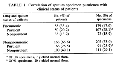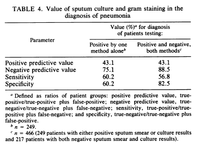 Notably, there was no clear discriminatory factor in purulent (aka a good sample) vs non purulent specimens in patients with pneumonia. The overall sensitivity of sputum gram stain or culture by themselves was about 60% which increased if both methods were either positive or negative: