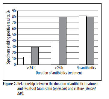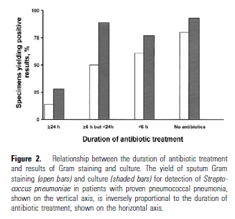 The sensitivity of sputum gram stain and culture were significantly impacted by antibiotic duration. For instance, in patients receiving >24hrs of antibiotics, only one patient out of 7 had a positive gram stain while 2 had positive cultures. In those treated for <24 hours for >6 hours, 9 patients (50%) had a positive gram stain while 16 (89%) had positive cultures: