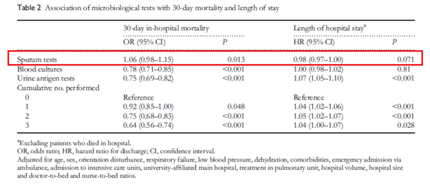 Short answer, likely not. As noted above (3), only one patient had directed antibiotic therapy according to diagnostic results. A Canadian study (8) evaluated 1362 patients with CAP, where sputum was collected from 539 patients. Of these, 507 (94%), were accepted and only 171 resulted with a positive culture (12.6% of the initial cohort). There was no difference in antibiotic therapy between groups, however there was a difference in mortality in patients who had a positive sputum culture (5.3%) versus those who did not (13.9%, p-value 0.002). This effect, however, disappeared on logistic regression analysis. In another Japanese study (9), the impact of urine antigens, blood cultures, and sputum cultures was analyzed on 30d mortality and length of hospital stay. Overall, both blood cultures and urine antigen tests were associated with decreased 30d in-hospital mortality, with each cumulative number of tests performed improving the odds ratio:
