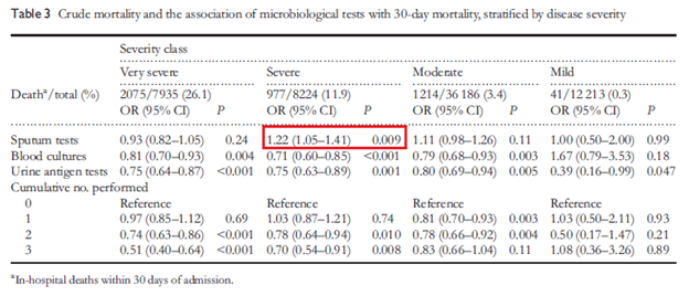 Based on severity, sputum testing was associated with higher mortality in those with severe pneumonia: