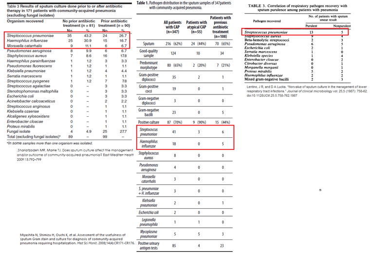 - Musher DM, Montoya R, Wanahita A. Diagnostic value of microscopic examination of Gram-stained sputum and sputum cultures in patients with bacteremic pneumococcal pneumonia. Clin Infect Dis. 2004;39(2):165-169. doi:10.1086/421497