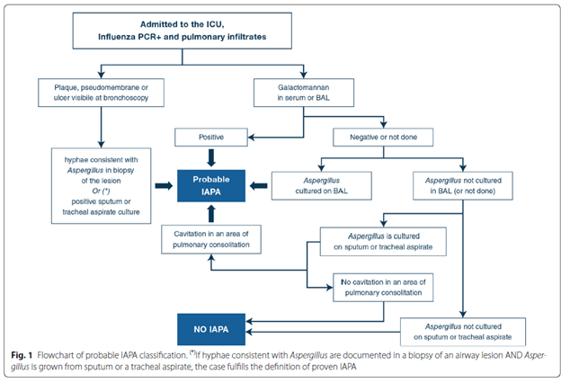 Of course, you can see the problem. If you go along with this diagnostic modality, you will miss patients who do not fall under the “classic” criteria such the severe influenza patients. Due to this, an alternative algorithm, the AspICU, was developed to be applied to the critically ill influenza patient (10).