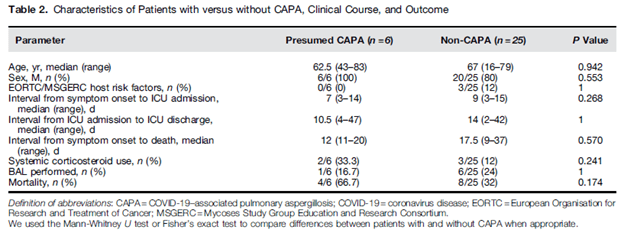 The largest cohort (13) evaluated 27 consecutive ventilated COVID patients and diagnosed putative IPA in 8 patients (30%) on day 3 after intubation. Putative diagnoses was considered if there was Aspergillus spp in BAL culture or if 2 other microbiological points were met (presence of Aspergillus spp in aspirate, +Aspergillus PCR in BAL, BA, or serum, GM >0.8 in BAL or >0.5 on serum, or BD glucan >80. None of the patients had classic risk factors and 6 of the 8 patients had received corticosteroids during the hospitalization. One review (1) suggests there is a difference between CAPA and flu-associated IPA, namely on their pathophysiology. For instance, the ACE-2 receptors are not commonly found in large airways and SARS-CoV2 has no know direct immune modulatory effect, suggesting there may not be a virus infection-related increase risk for IPA. The authors do note, however, this has not been extensively studied and while the virus itself may not increase the risk, it puts someone in a situation where there is higher risk for tissue invasion (i.e. severe COVID -> steroid administration + aspergillus colonization -> invasive disease).