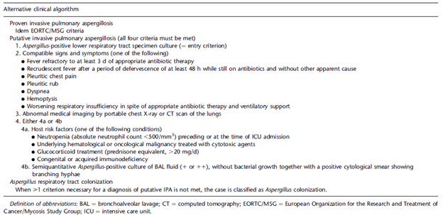 - Blot SI, Taccone FS, Van den Abeele AM, Bulpa P, Meersseman W, Brusselaers N, Dimopoulos G, Paiva JA, Misset B, Rello J, Vandewoude K, Vogelaers D; AspICU Study Investigators. A clinical algorithm to diagnose invasive pulmonary aspergillosis in critically ill patients. Am J Respir Crit Care Med. 2012 Jul 1;186(1):56-64. doi: 10.1164/rccm.201111-1978OC. Epub 2012 Apr 19. Erratum in: Am J Respir Crit Care Med. 2012 Oct 15;186(8):808. PMID: 22517788.