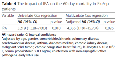 However, when comparing the influenza group and the pneumonia group, influenza was a significant risk factor for IPA, resulting with an aOR of 5.19 (95% CI 2.63-10.26):