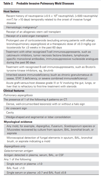 One of the interesting things here is these patients do not have the classic risk factors for IPA. For instance, in one cohort study (7) the overall incidence of influenza associated IPA was 16%, with 23% of these having some sort of azole resistance. Mortality in healthy patients was 5/7 (71%) compared to 9/16 (56%) of those who had co-morbidities. Of these 23 cases, 7 had no co-morbidities whatsoever, 3 had hematology malignancies, 2 were transplant patients, and 4 had some sort of autoimmune disease. Another review (8) found 36 cases in patients who were immunocompetent. This becomes an issue, since the EORTC/MSG criteria for probable IPA requires 3 criteria to be met, which include the host factors, clinical features, and mycological criteria (9):