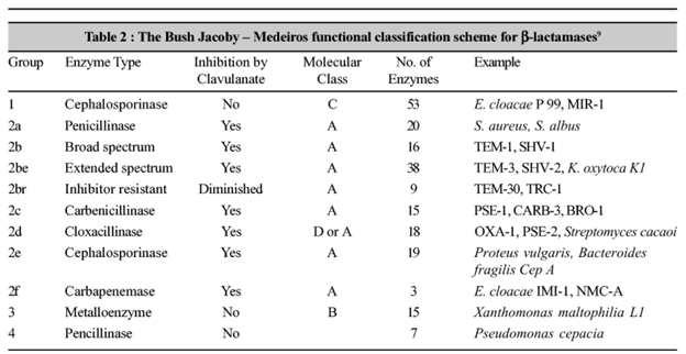 Grouping beta-lactamases based on the Bush Jacoby-Medeiros classification yields a scheme like this (5):
