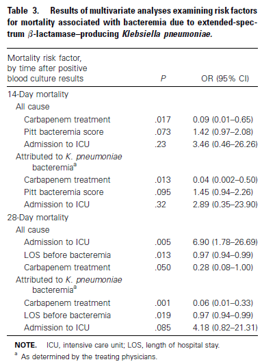 In another retrospective study (18) evaluating therapy for ESBL E.coli and K. pneuomniae, multivariate analysis did not show that the type of carbapenem was associated with increased mortality (aOR 0.26, p-value 0.12) and after controlling for propensity score, ertapenem was not associated with increased risk of death (OR 0.5, 95% CI 0.12 to 2.1). This all suggest that any carbapenem is a good option for ESBL bacteremias. Which is nice to have a good once a day carbapenem for possible OPAT.