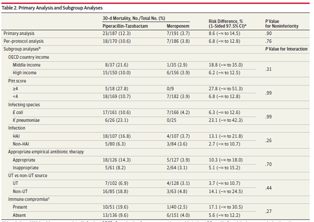 - Harris PNA, Tambyah PA, Lye DC, Mo Y, Lee TH, Yilmaz M, Alenazi TH, Arabi Y, Falcone M, Bassetti M, Righi E, Rogers BA, Kanj S, Bhally H, Iredell J, Mendelson M, Boyles TH, Looke D, Miyakis S, Walls G, Al Khamis M, Zikri A, Crowe A, Ingram P, Daneman N, Griffin P, Athan E, Lorenc P, Baker P, Roberts L, Beatson SA, Peleg AY, Harris-Brown T, Paterson DL; MERINO Trial Investigators and the Australasian Society for Infectious Disease Clinical Research Network (ASID-CRN). Effect of Piperacillin-Tazobactam vs Meropenem on 30-Day Mortality for Patients With E coli or Klebsiella pneumoniae Bloodstream Infection and Ceftriaxone Resistance: A Randomized Clinical Trial. JAMA. 2018 Sep 11;320(10):984-994. doi: 10.1001/jama.2018.12163. Erratum in: JAMA. 2019 Jun 18;321(23):2370. PMID: 30208454; PMCID: PMC6143100.