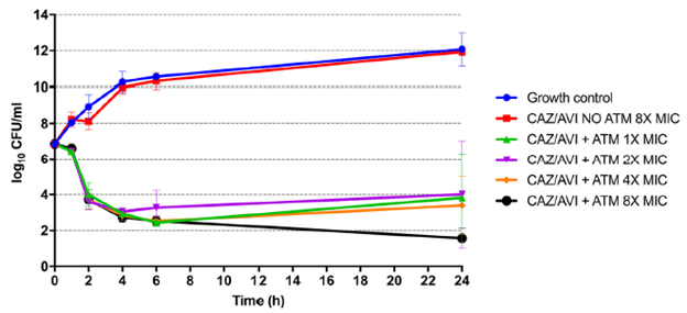Further, in the same study, using an in vivo mice thigh model, the combination was found to have an almost four-fold reduction in bacterial load at a lower dose of CAZ/AVI in combination compared to CAZ/AVI alone: