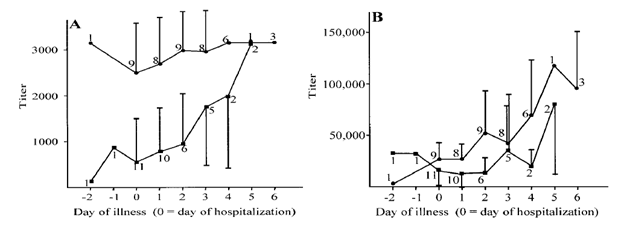 Notably, those who were less ill were more likely to have a titer <800 for neutralizing antibodies, suggesting a protective effect against illness severity. Furthermore, the levels of both titers increased over the hospitalization: