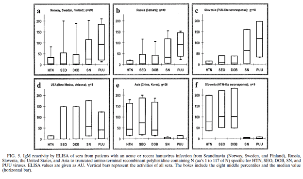 Another study (19) evaluated the efficacy of an ELISA for the serological diagnosis of several hantavirus infections based with the E.coli recombinant N antigen from 5 different hantaviruses (Hantaan, Seoul, Dobrava, Sin Nombre, Puumala). The sera from acute hantavirus infections were positive in those cases compared to healthy Swedish volunteers. Notably, depending on where the patient was from, IgG and IgM antibody varied. For instance, patients from Scandinavia and Russia reacted strongest to Puumala virus, while patients from Asia reacted to Hantaan, Seoul, and Dobravirus: