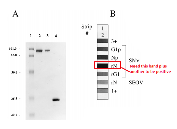 - Hjelle B, Jenison S, Torrez-Martinez N, Herring B, Quan S, Polito A, Pichuantes S, Yamada T, Morris C, Elgh F, Lee HW, Artsob H, Dinello R. Rapid and specific detection of Sin Nombre virus antibodies in patients with hantavirus pulmonary syndrome by a strip immunoblot assay suitable for field diagnosis. J Clin Microbiol. 1997 Mar;35(3):600-8. doi: 10.1128/JCM.35.3.600-608.1997. PMID: 9041397; PMCID: PMC229635.