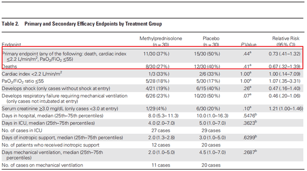 What about steroids? There is little data here as well. While they have been used in case reports, the only study was a phase , double-blind, RCT that evaluated methylprednisolone and placebo in 60 patients (26) with Andes virus. Primary endpoint was a composite of 28 day mortality, P/F ratio <55, CI <2.2, PEA, VT or Vfib. While patients in the placebo group were more likely to have shock (50% vs 30%), be intubated at enrollment (33.3% vs 13.3%) and have higher SOFA scores (7.9 vs 6.1), there were no differences in the composite primary endpoint: