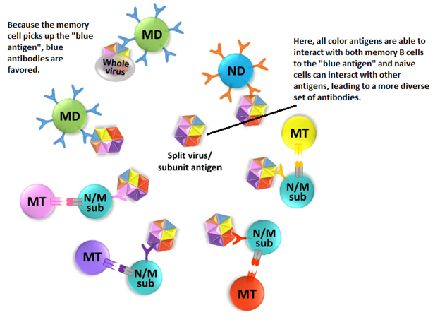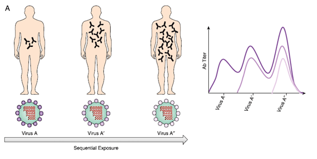 To keep it simple, the predominant antibody response tends to favor that of the first strain that was encountered. This does not mean antibodies will not be made towards other antigens, but rather that upon exposure to subsequent antigens, the original antibody will be “re-boosted.” A review proposes that memory B cells plays a major role in the mechanism (5). When a memory B cell captures an antigen that resembles a previously seen one (either a conserved or cross-reactive recognition site), these memory B cells kick start a mechanism that amplifies a previously antibody response. This is in comparison to naïve B cell, who may not mount an antibody against the already developed memory B cells. This has implications in vaccination. For instance, that same review proposed that a split virus/antigen may allow other native B cells to mount a memory response, rather than a “whole virus vaccine” which may favor an already memory B cell response that allows it to overtake the other antigens and favors the creating of more memory B cells and antibodies: