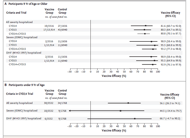 - Hadinegoro SR, Arredondo-García JL, Capeding MR, Deseda C, Chotpitayasunondh T, Dietze R, Muhammad Ismail HI, Reynales H, Limkittikul K, Rivera-Medina DM, Tran HN, Bouckenooghe A, Chansinghakul D, Cortés M, Fanouillere K, Forrat R, Frago C, Gailhardou S, Jackson N, Noriega F, Plennevaux E, Wartel TA, Zambrano B, Saville M; CYD-TDV Dengue Vaccine Working Group. Efficacy and Long-Term Safety of a Dengue Vaccine in Regions of Endemic Disease. N Engl J Med. 2015 Sep 24;373(13):1195-206. doi: 10.1056/NEJMoa1506223. Epub 2015 Jul 27. PMID: 26214039.