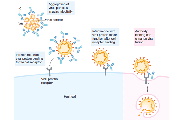 In general, virus elimination requires that an epitope (aka antigen) be recognized by the Fab region (9). The Fc region in turn binds to Fc gamma receptors in immune cells, leading to neutralization of the antigen: