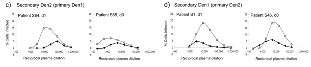 Furthermore, in another scenario of secondary infections, enhancement assays in 2 scenarios (Den1 followed by Den2 and Den2 followed by Den1) demonstrated that the concentration of immune serum required to enhance the second virus was greater than the concentration required to enhance the first virus: