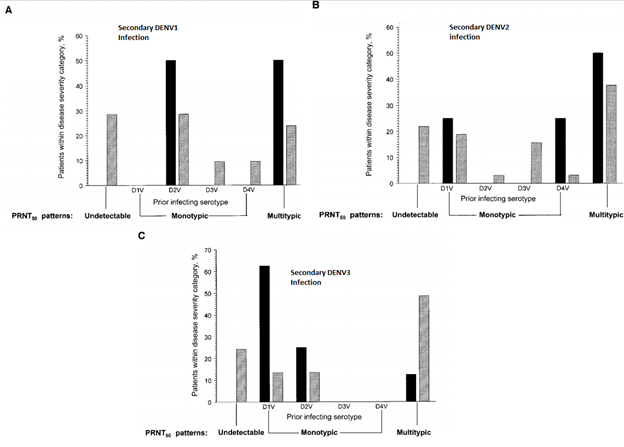The relationship of previous dengue antibodies and subsequent re-infection has been evaluated in several prospective studies. For instance, one prospective study of 153 Their children found that prior infection with a distinct serotype of Dengue was associated with increased incidence of hemorrhagic fever (12). Indeed, 17% of patients with a prior dengue infection were found to have hemorrhagic fever, compared to 0% of those who did not have a prior infection.