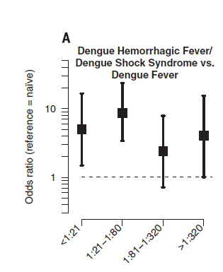 Notably, there was no statistical difference in incidence of dengue and dengue hemorrhagic fever in those who were subsequently infected with either DENV1 or DENV2 and had another infection with another strain in the past (though the correlation is there). The same study found that pre-exisiting levels of DENV3 antibodies were associated with lower viremia in DENV3 infections, a pattern not seen in DENV1 or DENV2. Despite this finding, not all antibody titers are equal. For instance, in one study of 6684 children (13) who had at least one DENV-Ab titer measured, those who pre-existing titers of 1:21 to 1:80 had a higher risk of dengue hemorrhagic fever (OR 7.64, 95% CI 3.19 to 18.28):