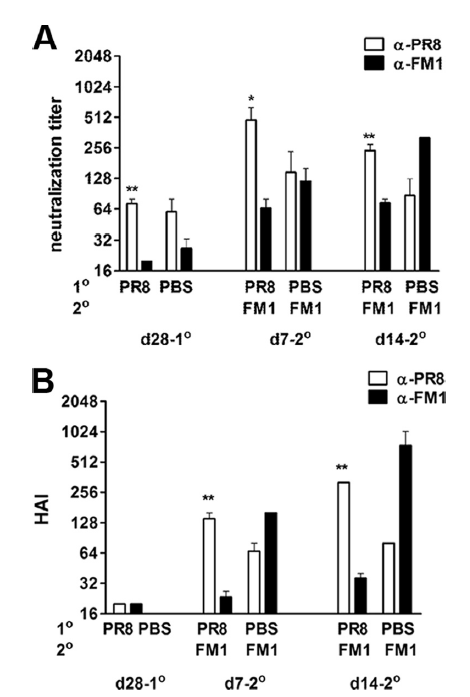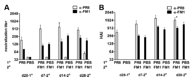 This suggest that the ability to mount a response against a live virus is impacted by the initial virus you are immunized against. Indeed, this was seen in PR8-HA primed mice, where FM1-HA vaccination induced a higher HAI against PR8: