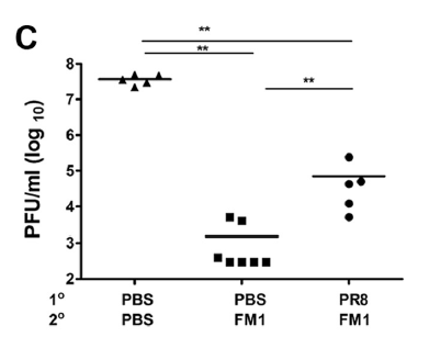 When evaluating viral titers in mouse lung tissue, controls had significantly higher viral titers of FM1 virus. Notably, however, those who were immunized only with FM1 had significantly lower viral titers compared to those who were first immunized against PR8 followed by FM1: